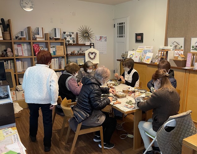 ハート型の壁掛けリース造りで皆さん和気あいあいと楽しそうに製作されておりました。